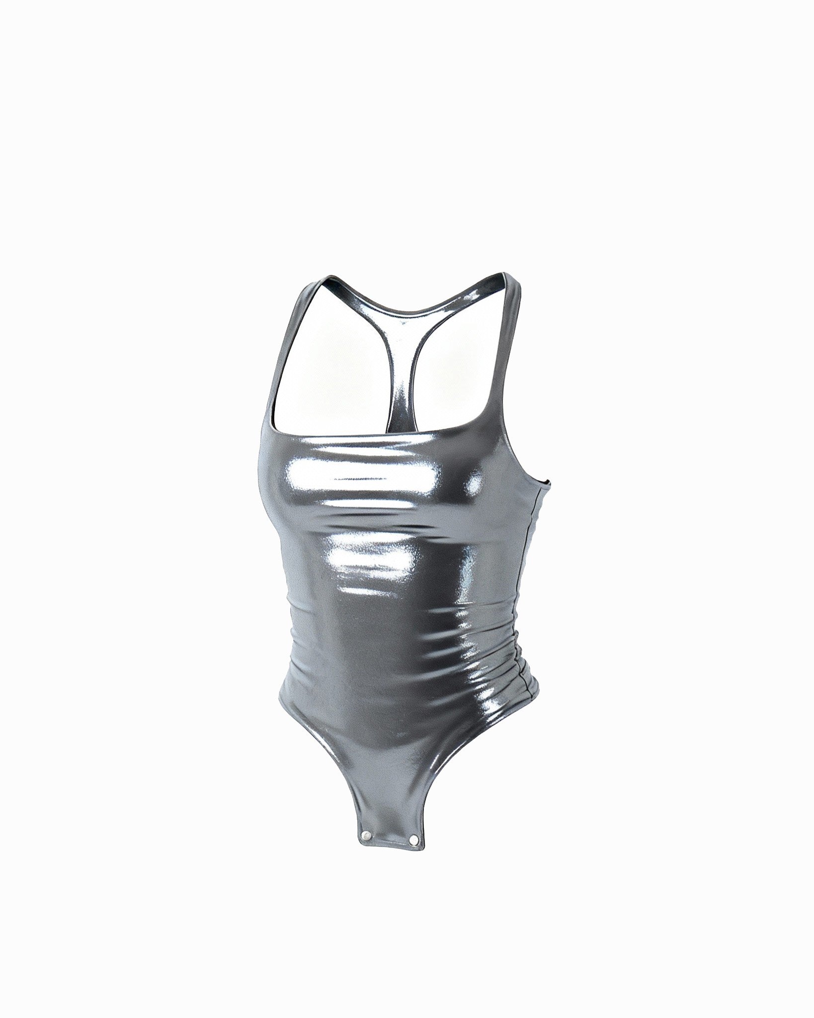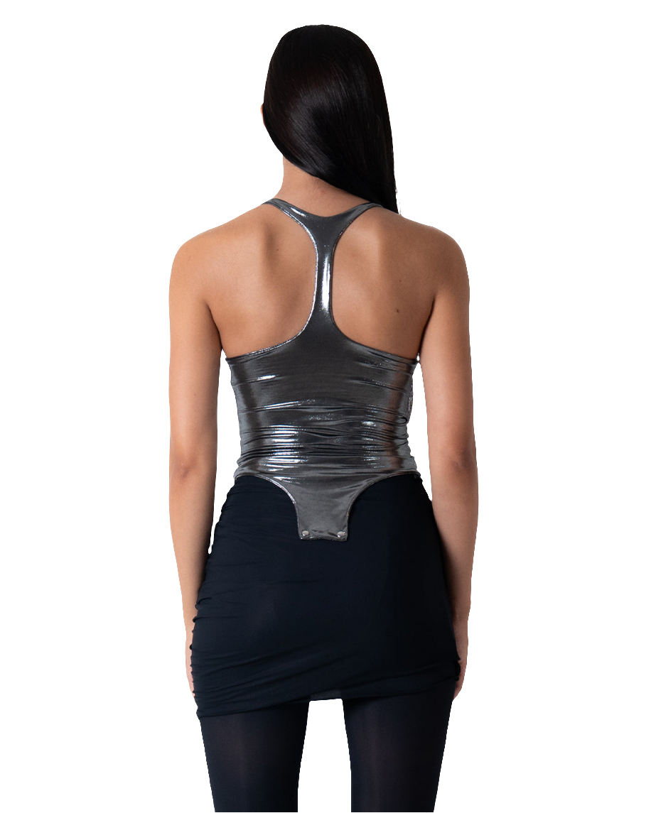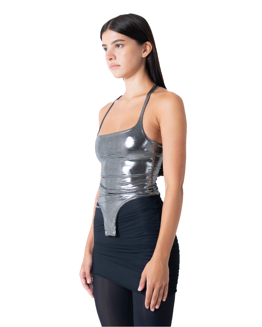 DEADSTOCK SILVER GLOSSY LYCRA TOP. DEEP SQUARED NECKLINE, THIN CROSSOVER BACK. THE LOWER PART RESEMBLES A BODY WITH STUDS AS BUTTONS.
