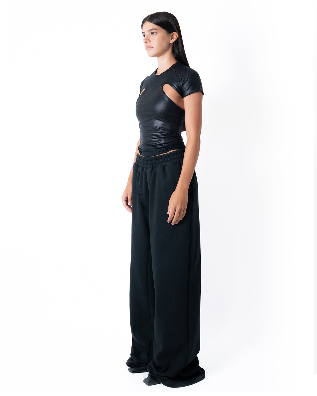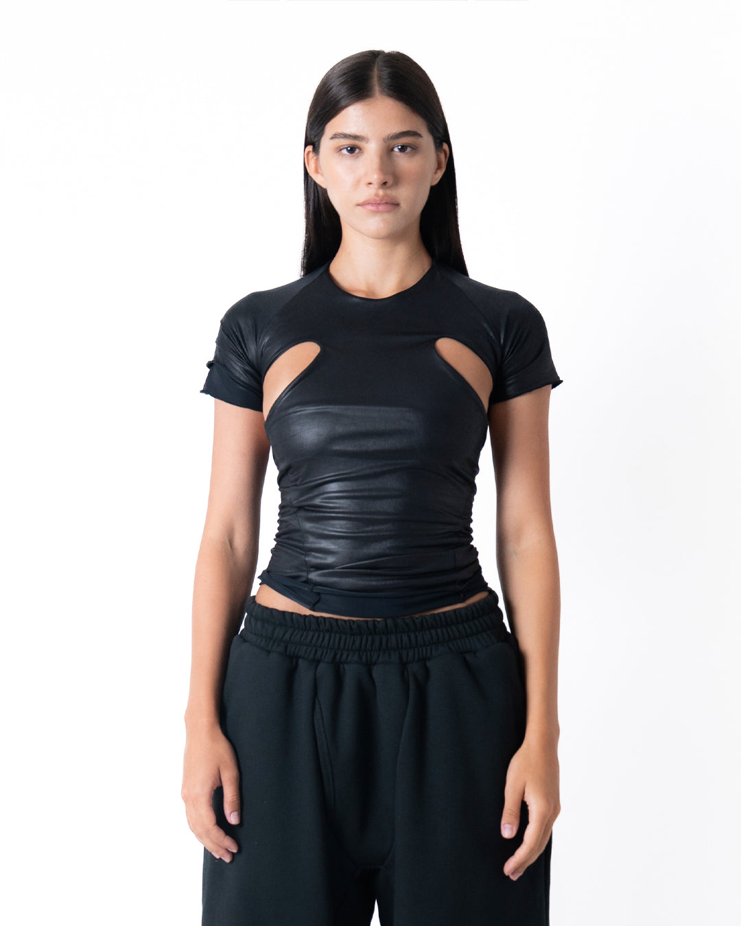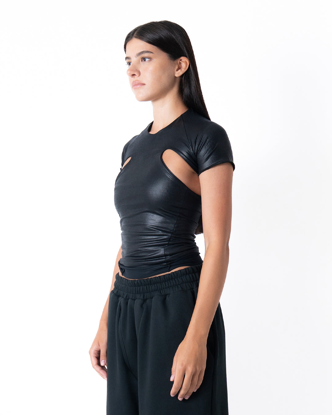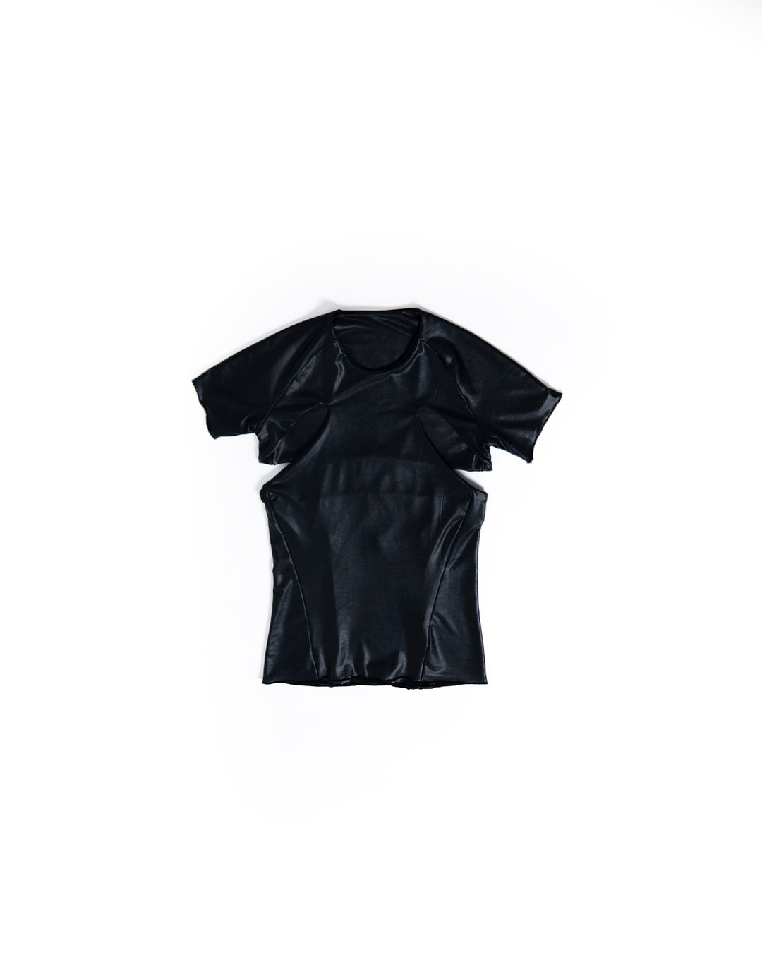 DEADSTOCK BLACK GLOSSY LYCRA T-SHIRT. DOUBLE-LAYERED AND WITH A CUT-OUT ABOVE THE BUST EXTENDING TO THE BACK.