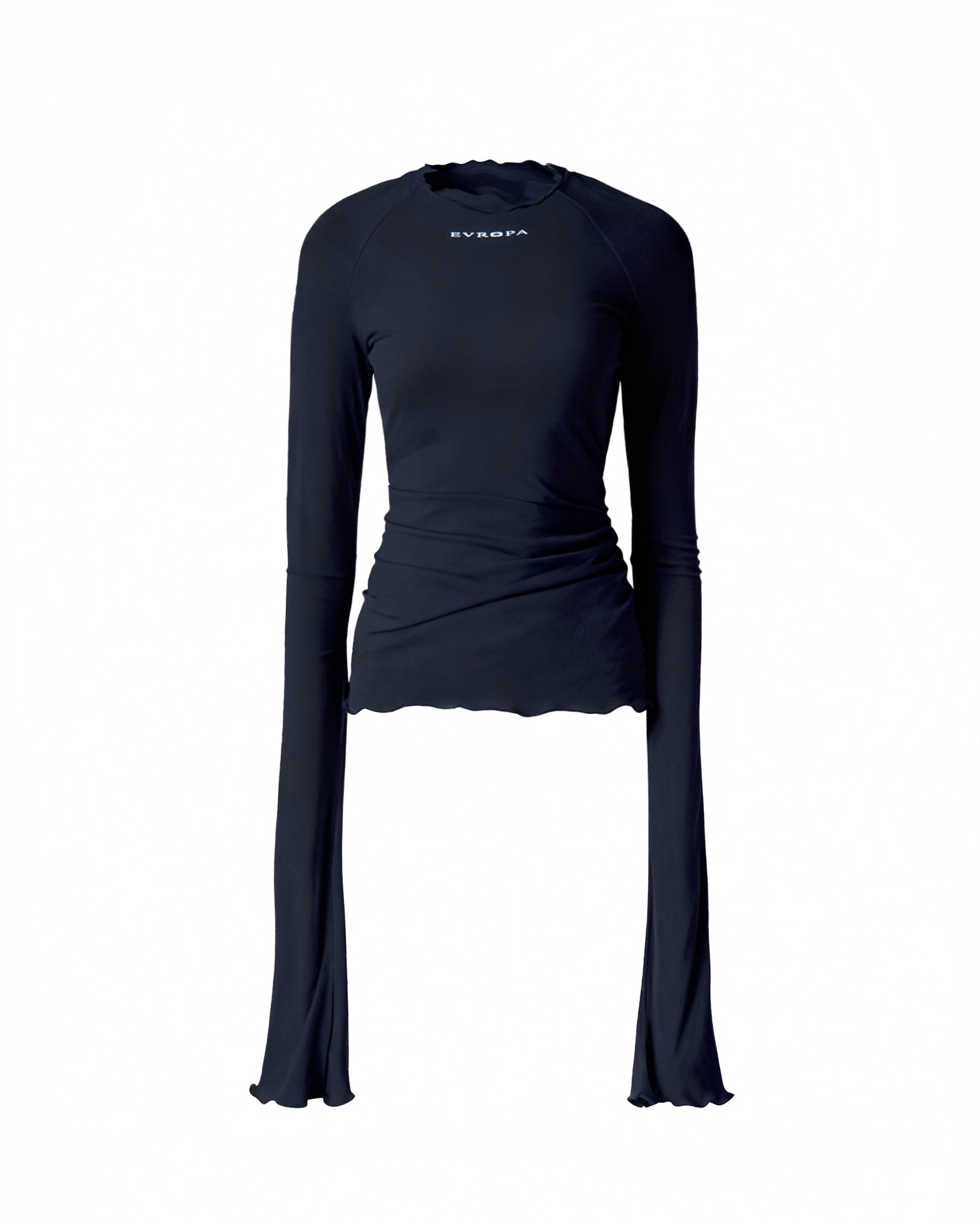 DEADSTOCK LYCRA T-SHIRT. EXTRALONG SLEEVES FOR DRAPED FIT. SMALL LOGO ON THE FRONT.