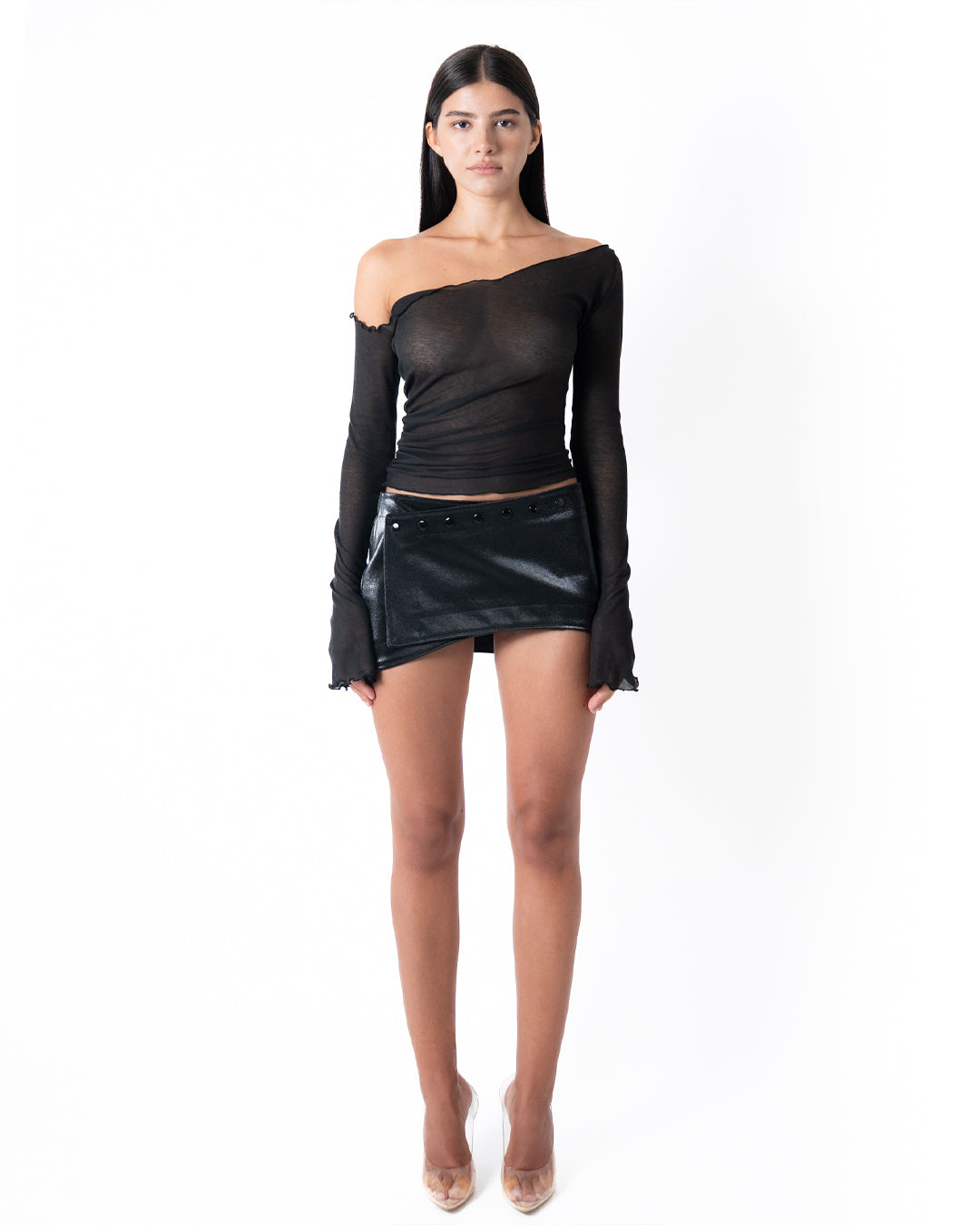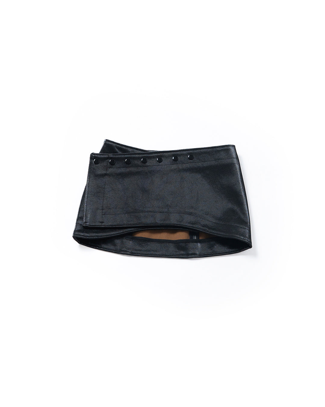 UNISEX MINI SKIRT MADE OF DEADSTOCK FABRIC AND METAL HARDWARE. MICRO SKIRT CAN ALSO BE WORN AS A BELT, LOW AND UNBALANCED WAIST. STRAIGHT FIT. MULTILINE STRUCTURE WITH SNAP-STUD DECORATION. COTTON COATED WITH GLOSSY VARNISH, AGED EFFECT ON SEAMS. ADJUSTABLE WRAP CLOSURE